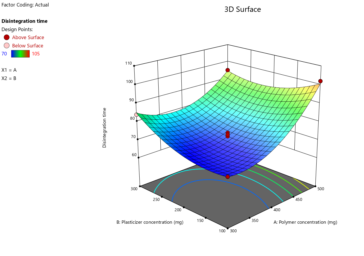The quadratic terms for both polymer concentration (A²) and plasticizer concentration (B²) were statistically significant. The A² term contributed 678.37 to the sum of squares, with an F-value of 301.97 (p-value<0.0001), indicating that the effect of polymer concentration on disintegration time is nonlinear. Similarly, the B² term contributed 220.11 to the sum of squares, with an F-value of 97.98 (p-value<0.0001), suggesting a nonlinear influence of plasticizer concentration on disintegration time. The Lack of Fit was found to be not significant (p-value = 0.5708), indicating that the model provided a good fit to the data without significant unexplained variability.