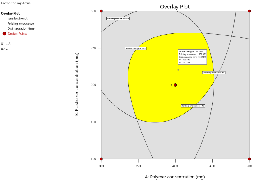 The MODR (Method Operable Design Region) is graphically represented in fig. 5, illustrating the optimal ranges of polymer (400 mg) and plasticizer concentrations (220 mg) for achieving the desired responses-tensile strength, folding endurance, and disintegration time-in Escitalopram oral thin films. Final formulation details with all ingredients for the optimized formulation were enumerated in table 5.