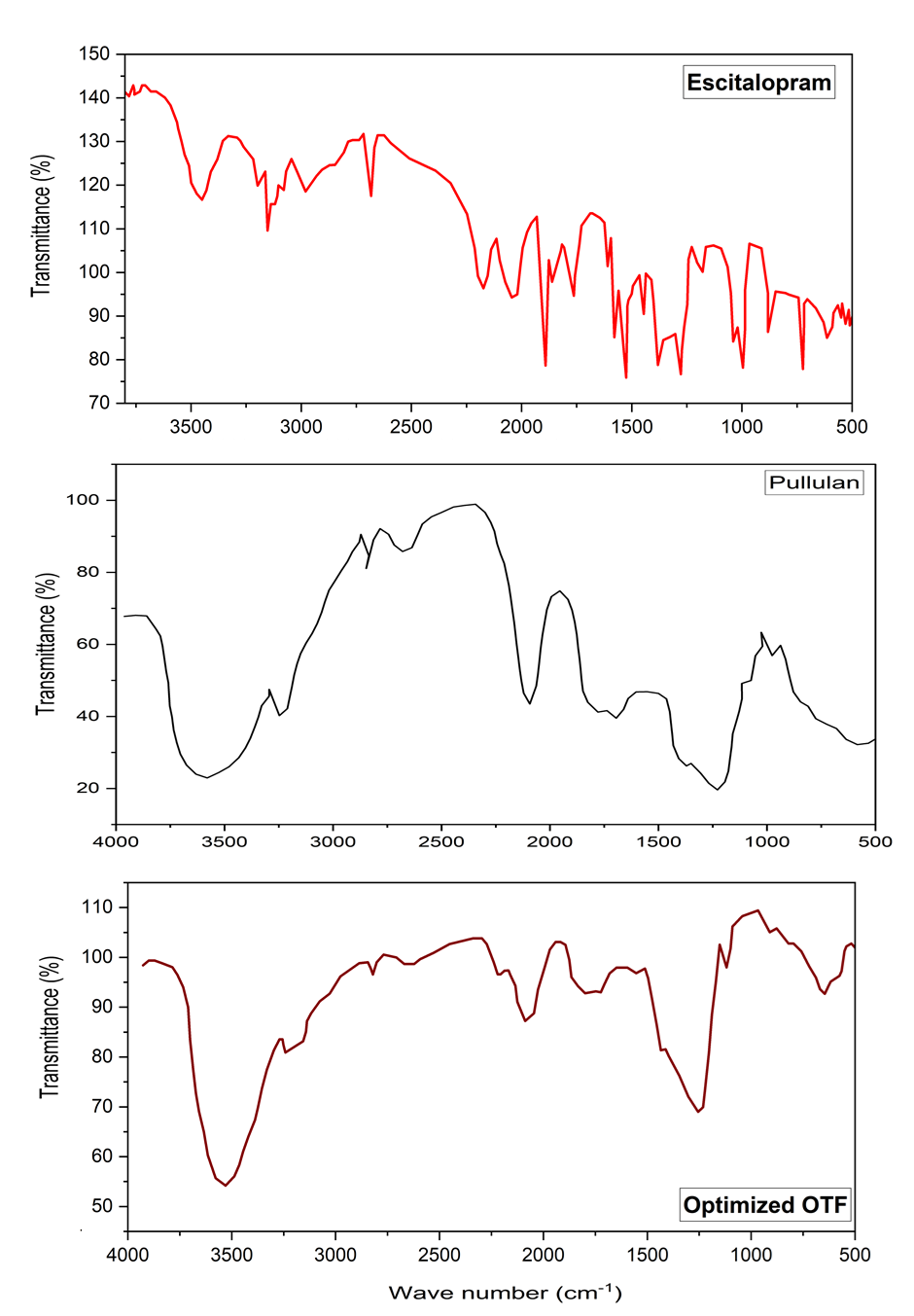 FTIR spectra of Escitalopram, pure Pullulan, and the optimized Escitalopram-pullulan OTF (fig. 6) were analyzed to assess molecular interactions and excipient compatibility. The spectrum of pure Escitalopram exhibited characteristic peaks corresponding to its functional groups, including O–H stretching (3500–3200 cm⁻¹), aromatic C=C stretching (1600–1500 cm⁻¹), and C–N stretching (1200–1000 cm⁻¹). Pullulan displayed broad O–H stretching (3400 cm⁻¹), C–H stretching (2900 cm⁻¹), and C–O–C stretching (1000–1200 cm⁻¹), confirming its polysaccharide structure.