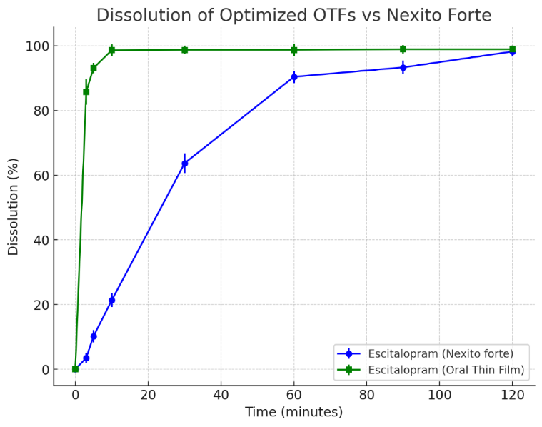 The systematic optimization of Escitalopram OTFs underscores the critical role of excipient selection in tailoring mechanical and dissolution properties. The superior dissolution profile of the optimized OTF (F8) over conventional tablets suggests promising clinical benefits, particularly for patients with dysphagia or those requiring rapid therapeutic onset. These findings are in line with recent advancements in OTF technology, where fast-dissolving films have demonstrated improved patient compliance and pharmacokinetic performance [30]. However, further in vivo pharmacokinetic studies are warranted to validate the bioavailability and therapeutic efficacy of this formulation compared to existing oral dosage forms.