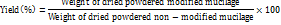 The percentage yield of the Carboxymethylated mucilage after modification was calculated using the formula: