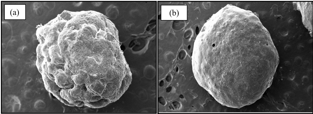 Fig. 1: Scanning electron microscopy photographs (a) Blank Basella alba mucilage-based hydrogel bead (magnification-121X) (b) Diclofenac sodium loaded Basella alba mucilage-based hydrogel beads (magnification-94X)