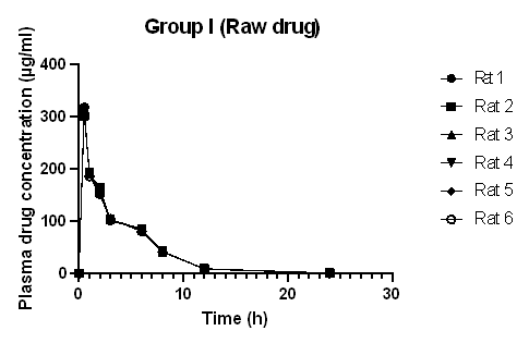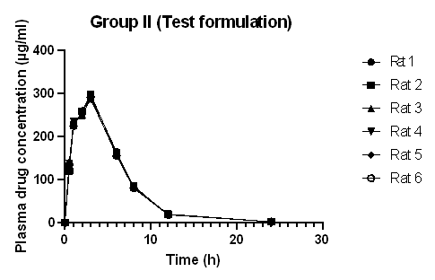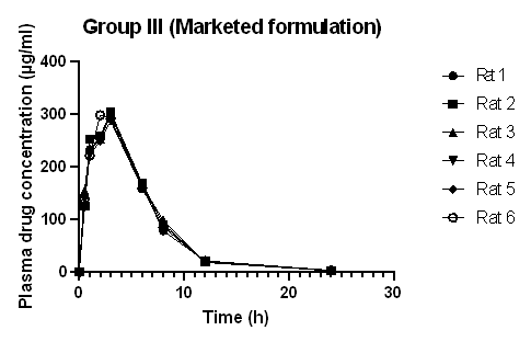 All the experimental results were expressed as Mean± Standard Deviation (SD). The significant difference between the group-administered raw drug (Group I) with the group-administered test (Group II) and marketed formulation (Group III) was statistically analyzed using one-way ANOVA (Analysis of Variance) and graphs were plotted using Graph Pad Prism 9 software. The p-value (p<0.01) was considered the significant level.