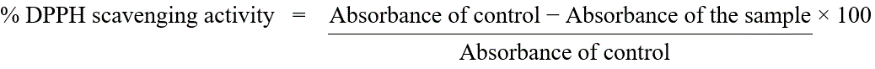 A DPPH scavenging assay was used to estimate the extracts' free radical scavenging activity [19-21]. The methanol was used to prepare a 0.1 mmol DPPH solution, and 1.6 ml of methanol extract at various concentrations (62.5, 125, 250, 500, and 1000µg/ml) was added to 2.4 ml of DPPH solution. The mixture was thoroughly vortexed and kept in the dark at room temperature for 30 min. Using spectrophotometry, the mixture's absorbance was measured at 517 nm. The following formula was to determine the percentage DPPH scavenging activity: