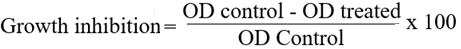 After the time period, the drug-containing media was aspirated, and 100 μl of MTT (5.0 mg/ml) in PBS was added to each well and incubated for 4 h at 37˚C. To solubilize the dark blue formazan crystals, 100 μl of DMSO was added and mixed gently. After solubilization at room temperature, the absorbance was read at 570 nm and also at 630 nm using a microplate reader. The IC50 was made from the dose-response curve [40, 41]. The growth inhibition was calculated using the formula below: