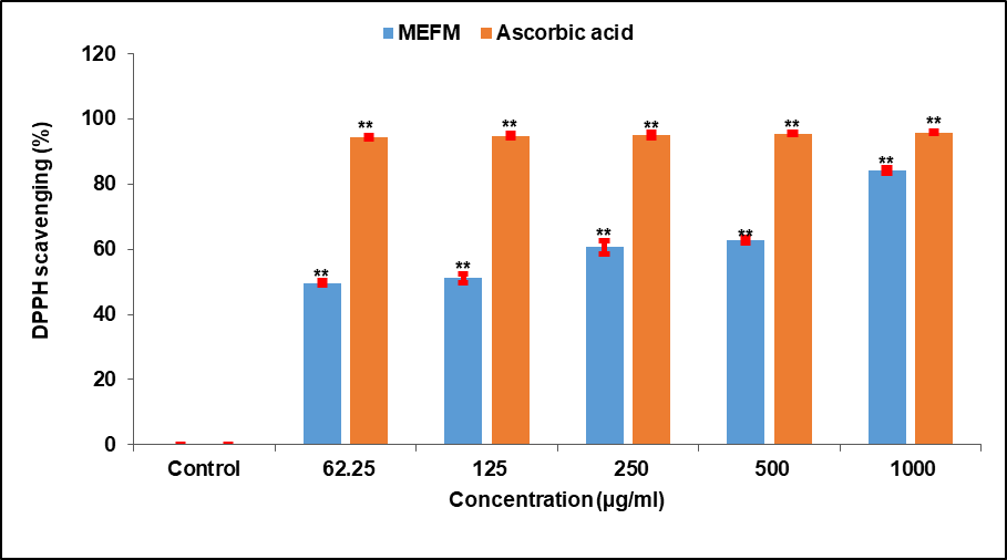 Fig. 1: DPPH scavenging activity of MEFM compared to ascorbic acid control. Data are presented as mean and standard deviation (mean±SD) of three replicates mean values (bar graphs), Standard deviation (vertical lines), Asterisk (**) above the bars is statistically significance (P ≤0.001)