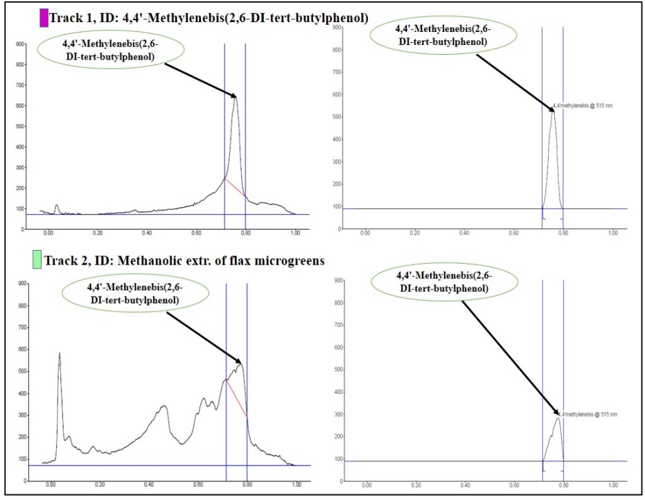 HPTLC was conducted on a silica gel 60 f 254 (3.0 × 10 cm; Merck, Germany) HPTLC plate. The plate was kept in an automatic development chamber with a mobile phase consisting of ethyl acetate: toluene: formic acid in a 5:4:0.2 (V/V/V%) ratio. Using an automated spray applicator with a 100 µl** syringe, 6.0 µl** of both extract and the standard solution of 4,4’-M(2,6-DTBP) with a concentration of 1 mg/ml was applied to the plates in the form of 8.0 mm bands at the rate of 150 nl/s. The CAMAG-Linomat IV was used for sample application, and its settings were as follows: application rate of 150 nl/s, band length of 8.0 mm, distance between bands 10 mm, distance from the bottom of the plate measuring 10.0 mm, and distance from the plate side edge of 5 mm. WIN CATS program version 1.4.6.2002 was used to densitometrically evaluate the bands using CAMAG TLC Scanner 3. The following were the settings for the scanner: (Scanning rate: 20 mm/s; Slit dimension: 6.00 x 0.45 mm; Mode: absorption/reflection; monochromator bandwidth: 30 nm at an optimum wavelength of 515). The retention factor (Rf) value was calculated as: