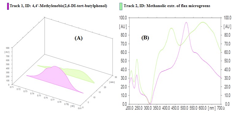Fig. 3: (A) 3D Chromatogram of 4,4’-M(2,6-DTBP) from extract and standard. (B) Overlay of HPTLC chromatogram of all tracks