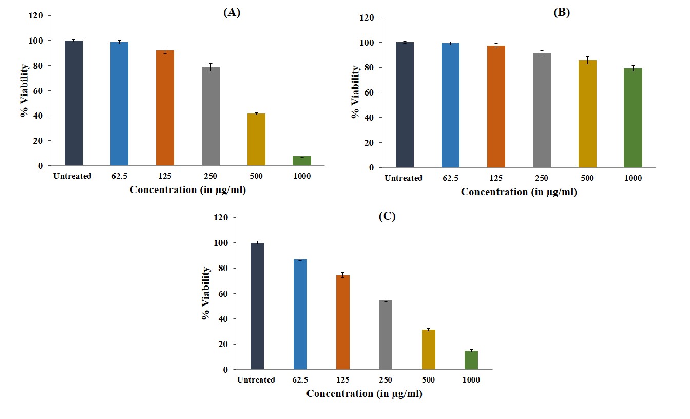 The PC-3 cell lines were obtained from the National Centre for Cell Science (NCCS), Pune. The cells were cultured in DMEM containing 10% FBS, 200 μl of the cell suspension (about 10,000 cells) was placed in 96-well plates, and the plates were kept in a 37 °C and 5% CO2 atmosphere for 24 hrs. The test samples were solubilized using DMSO, diluted into culture medium containing serum-free medium. After 24 hrs, spent mediums were replaced with mediums containing test samples in various concentrations (62.5, 125, 250, 500, and 1000µg/ml) and incubated for 24 hrs in CO2 incubator (37 °C and 5% CO2)