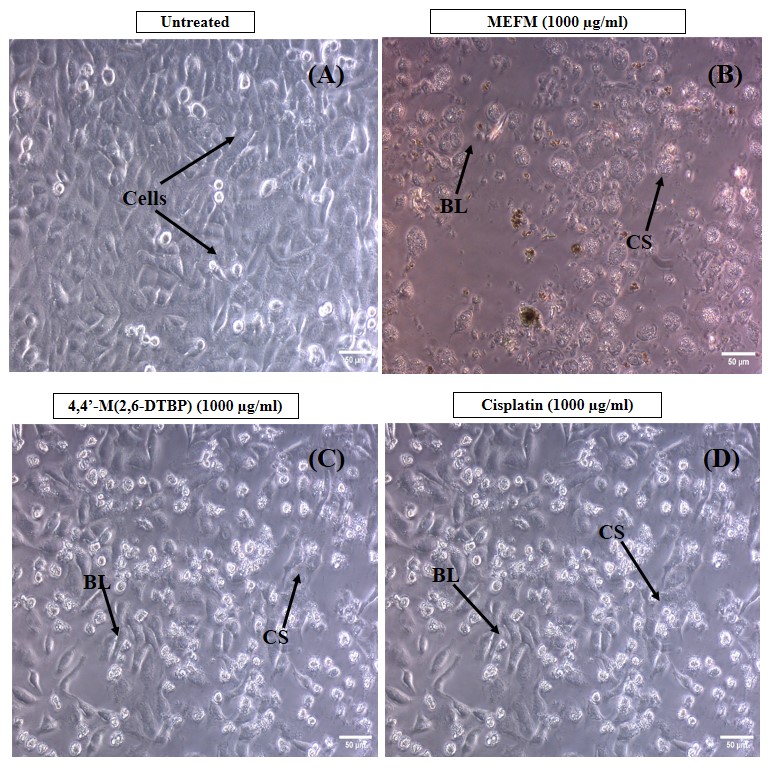 Fig. 5: Morphological changes in PC-3 cell lines at 24 h of treatment. (A) Untreated, (B) MEFM, (C) 4,4’-M(2,6-DTBP), and (D) Cisplatin. CS cellular shrinkage, BL membrane blebbing