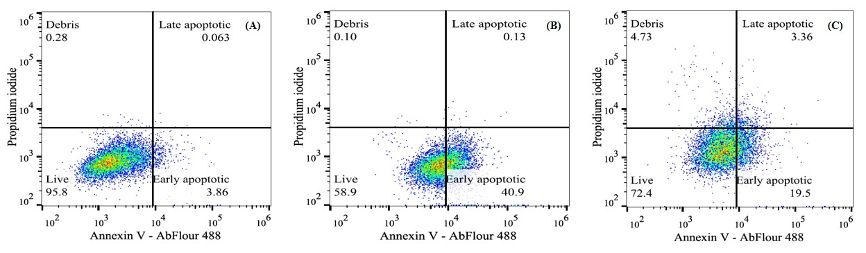 PC-3 cells were cultured in a 6-well plate with a seeding density of 3 x 105 cells per 2 ml. Cells were incubated in a CO2 incubator overnight at 37ᵒ C for 24 hrs. Following this, the spent medium was discarded, and the cells were rinsed with 1 ml of 1X PBS. The cells were then treated with 2 ml of culture medium containing the necessary concentration of experimental test compounds and cultured for 24 hrs. Some of the wells were left untreated as a negative control. At the end of the treatment, the cells were harvested directly into centrifuge tubes and washed with 500 μl PBS. The PBS was removed and then incubated with 200 μl trypsin-EDTA at 37 °C for 3-4 min. The culture medium was then returned to their original wells while collecting the cells into the centrifuge tubes. Afterward, the tubes were centrifuged at 300 x g for 5 min at 25 °C. The supernatant was cautiously decanted, washed twice with PBS, and PBS was decanted completely. Cells were resuspended in a concentration of 1 x 106 cells per ml in 1X Binding Buffer. 100 μl of the solution containing 1 x 105 cells was added into a 5 ml culture tube, and subsequently, 5 μl of AbFlour 488 Annexin V to the mixture was added and incubated for 15 min at 25 °C in the dark with gently vortex. 400 μl of 1X Binding buffer and 2 μl of PI were added to each tube, followed by gentle votexing. The samples were subjected to flow cytometry analysis as soon as the PI was added [42, 43].
