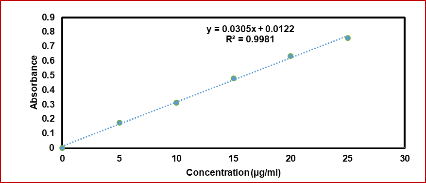 The current analytical technique complied with Beer's rule within the measured concentration range of 5–25μg/ml, which rendered it appropriate for abiraterone acetate quantification in phosphate buffer with a pH of 7.4. The linear regression's R2 value was discovered to be 0.9981. Y=0.0395x+0.0122 is the calibration curve linear regression equation (fig. 1).