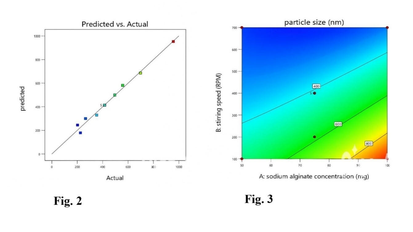 Fig. 2, 3: Predicted v/s actual correlation of particle size, contour plot for sodium alginate concentration and stirring speed against particle size