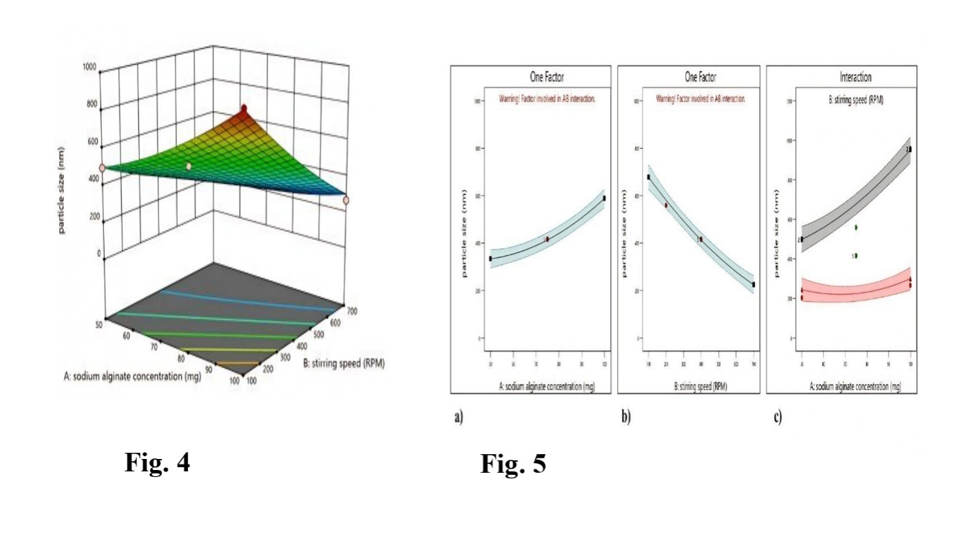 Fig. 4, 5: 3D surface plots sodium alginate concentration and stirring speed against particle size, Interaction graph for sodium alginate concentration (a), stirring speed (b), sodium alginate concentration, and stirring speed (c) on particle size