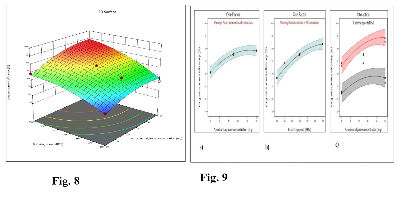 Fig. 8, 9: 3D surface plots sodium alginate concentration and stirring speed against DEE, Interaction graph for sodium alginate concentration (a), stirring speed (b), sodium alginate concentration, and stirring speed on DEE
