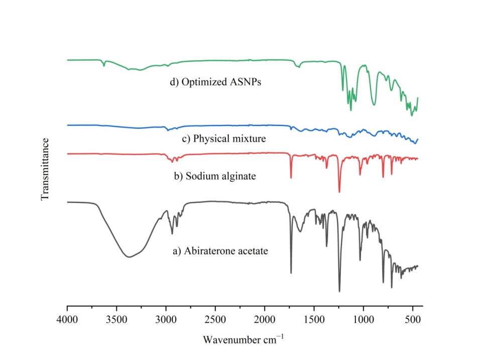 The FTIR spectroscopic assessment was executed using a Shimadzu FTIR Spectrophotometer, and investigating the drug-polymer compatibility, the KBR pellet method was used to capture the FTIR spectra of pure abiraterone acetate, sodium alginate, and optimized ASNPs. The spectra were taken at a range of 4000 cm−1 to 400 cm−1.
