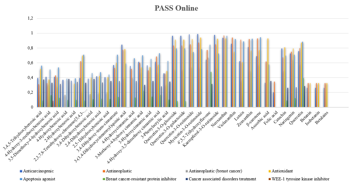 Based on the results, 35 compounds were predicted to have antioxidant activity, 30 demonstrated antineoplastic activity, 20 compounds had cancer-associated disorders treatment activity, 27 compounds were predicted to have antineoplastic (breast cancer) activity, five had breast cancer-resistant protein inhibitor activity, and one had WEE-1 tyrosine kinase inhibitor activity [31].