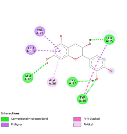 On CHK1, five compounds, namely 3,4,5-Trihydroxybenzoic acid, 3-Methoxy-4-hydroxy cinnamic acid, 4-Hydroxybenzoic acid, 3-Phenyl acrylic acid, and 3-(3,4-Dihydroxy cinnamoyl)quinic acid, were found to have identical hydrophobic amino acid residues as native ligand and drug. Meanwhile, on WEE1, the native ligand, the comparator, and the results by Squire et al. (2005) share the same hydrophobic and hydrogen bonding with eleven active compounds. These include3,4,5-Trihydroxybenzoic acid, 3,5-Dimethoxy-4-hydroxybenzoic acid, 2,3,7,8-Tetrahydroxy-chromeno[5,4,3-cde]chromene-5,10-dione,3-(3,4-Dihydroxy-cinnamoyl)quinic acid, 3-Methoxy-4-hydroxy cinnamic acid, 4-Hydroxy-3,5-dimethoxy cinnamic acid, 4′,5,7-Trihydroxyflavone, Catechin, Quercetin, Betanin, and Isobetanin. Docking of red spinach compounds showed conventional and carbon-hydrogen bonds. An increased number of hydrogen bonds contributes to a more stable connection between the ligand and the protein. Both the hydrophobic and hydrogen bonds formed served as indicators of interaction intensity between the protein and ligand [35].