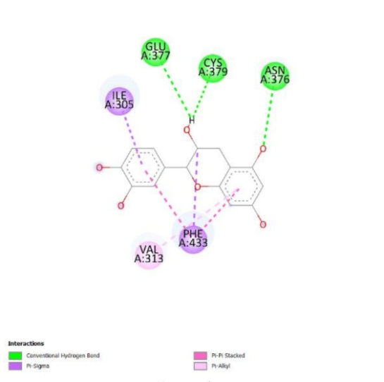 Fig. 6: Molecular docking results showing key hydrogen bond and hydrophobic interactions between CHK1, WEE1 and selected red spinach compounds