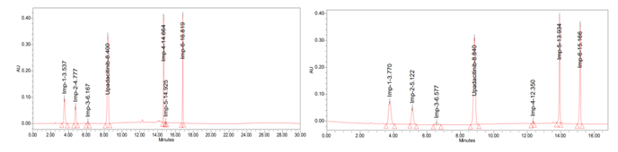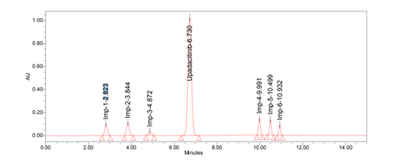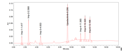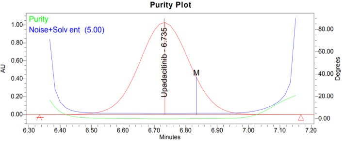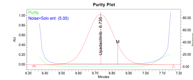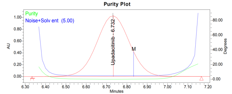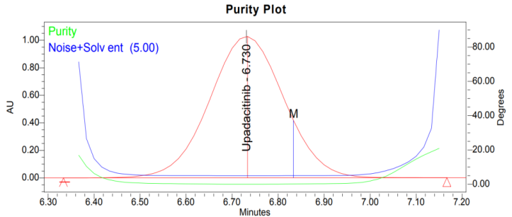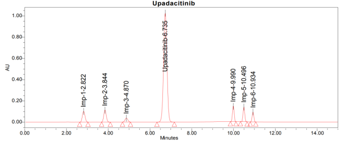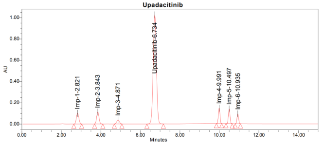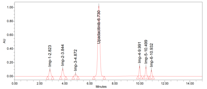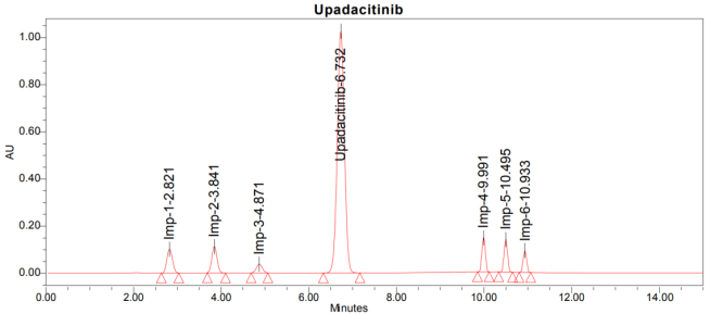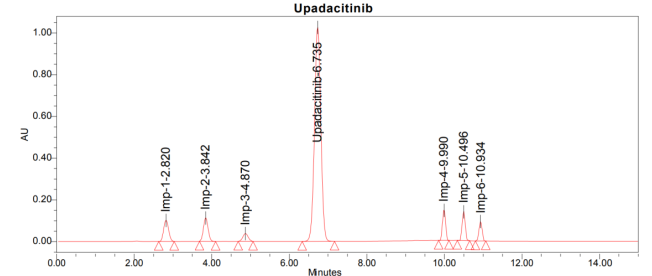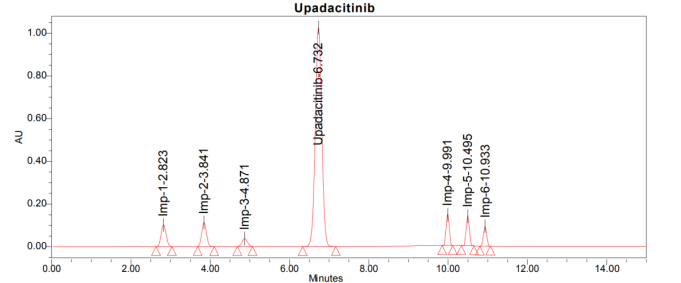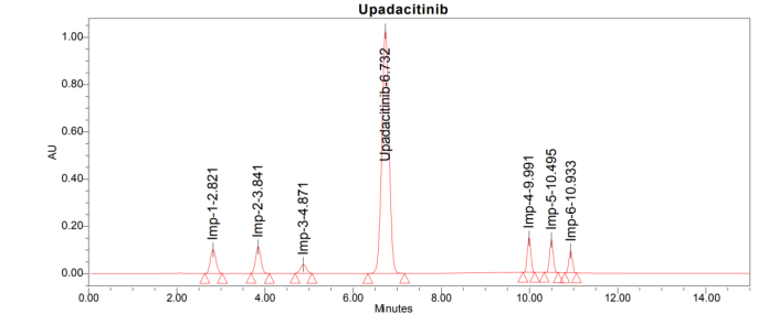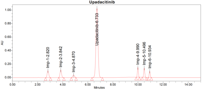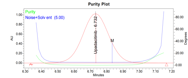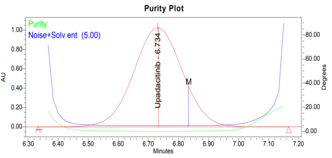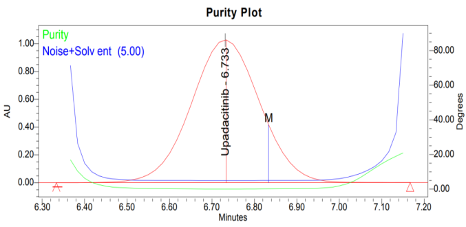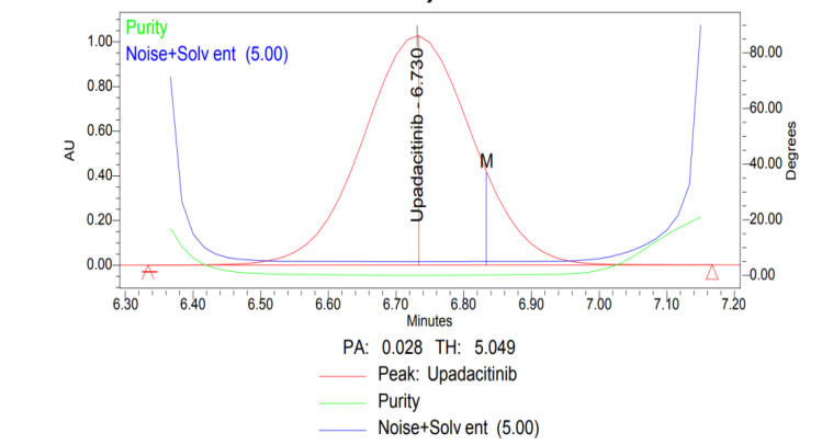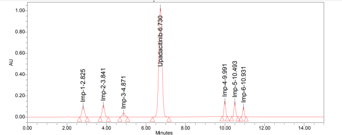 Following the establishment of a novel RP-UPLC isocratic technique, Upadacitinib and its designated impurities (impurities 1, 2, 3, 4, 5, and 6) were used for authentication. Among other system suitability parameters, the USP resolution is greater than or equal to 2, the USP plate count exceeds 4000, and the USP tailing is good. The resulting peaks are uniform since there is no purity flag and the purity angle is below the purity threshold. This indicates that the method is robust and reliable for the analysis of Upadacitinib, ensuring accurate quantification of both the active pharmaceutical ingredient and its impurities. Furthermore, these findings support the method's potential for quality control in pharmaceutical applications, contributing to enhanced drug safety and efficacy s technique was validated according to ICH standards, which means that all validating parameters, including robustness, accuracy, and precision, were within acceptable boundaries. As a result, this method was chosen for further studies aimed at assessing the stability of Upadacitinib under various environmental conditions. The comprehensive validation process not only reinforces the method's credibility but also paves the way for its implementation in routine testing to ensure consistent product quality. General analysis. Finally, there are reasonable restrictions on the system-appropriate and validation parameters.