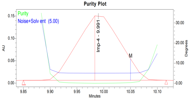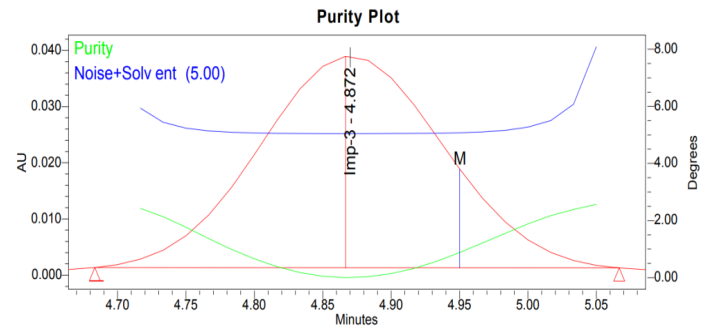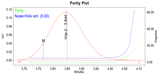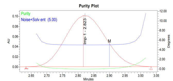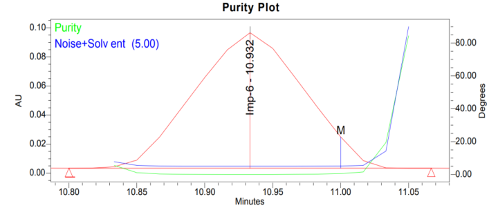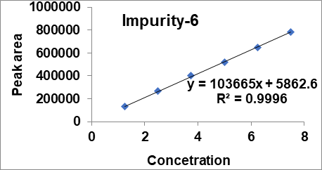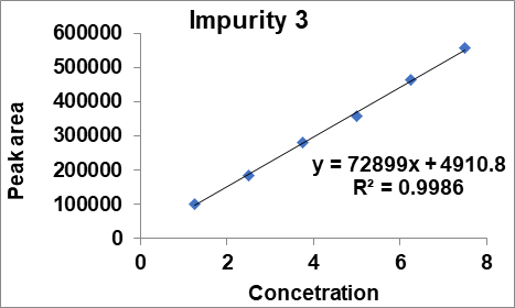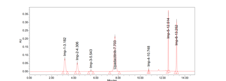 The final phase of the trial (table 2) was conducted using a Waters X-Bridge Phenyl 250x4.6 mm, 5µ, column and the mobile phase is 2.5 g sodium hexane-1-sulphonic acid in 1 l water adjusting the pH-3.0 with diluted formic acid: methanol (60:40) this trial was followed by a system suitable for conditions (fig. 11). USP tail factors (acceptable value equal to 2 or less than 2) of drug and its impurities values are 1.05, 1.25, 1.35, 1.58, 1.36,1.24, and 0.69. USP plate count (acceptable value more than 4000) of the drug and its impurities values are 8058, 2225,4768,5748,56921,61902, 68306. USP resolutions (acceptable more than 2) of the drug and its impurities (imp-1, imp-3, imp-4, imp-5, and imp-6) values 6.69, 4.54, 4.87, 13.24, 3.36 and 2.57. Finally, the method is accepted according to ICH rules (table 3).