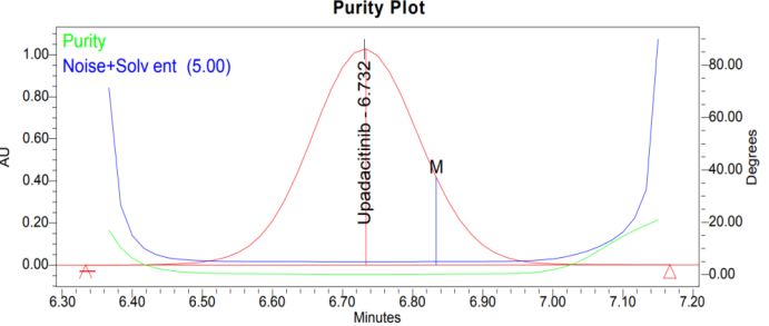 According to the most recent guidelines, the final optimum conditions are verified [13]. Stress samples were suitably diluted to provide the closing concentration while maintaining the intended technique conditions (50 µg/ml of Upadacitinib), and they were correlated with blank and standard chromatograms.