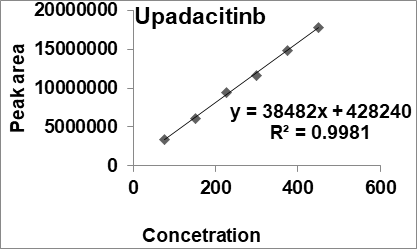 Results: Sharp peaks of Upadacitinib and its impurities were detected at 6.730, 2.823, 3.844, 4.872, 9.991, 10.499, and 10.932 min, respectively, at 256 nm as the peak using the PDA detector. Among other aspects of system suitability, USP resolution is greater than or equal to 2, USP plate count exceeds 4000, and USP tailing is good. Purity Flag "No" means that the peak is uniform (provided by Empower program). If the purity angle is smaller than the purity threshold, the peak is homogeneous. The procedure was verified in accordance with the ICH recommendations. The procedure was validated in accordance with ICH recommendations. The concentration ranges of Upadacitinib (75–450 µg/ml), impurities 1, 2, 4, and 5 (2.50–15.00 µg/ml), and impurities 3 and 6 (1.25–7.50 µg/ml) were all subjected to linear regression for the calibration curve. LOQ (34.41, 0.057, 0.211, 0.181, 0.151, 0.377, and 0.165 µg ml–1) and LOD (11.35, 0.019, 0.070, 0.060, 0.049, 0.124, and 0.055 µg ml–1) for and Upadacitinib and impurities, respectively. Accuracy, precision, and resilience were among the other confirmed characteristics that were within acceptable ranges.