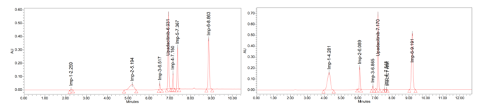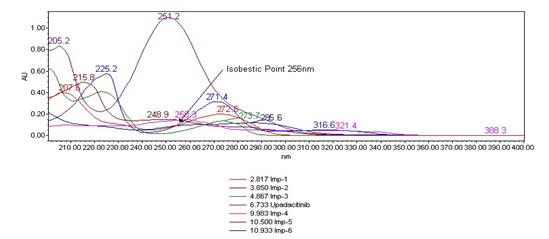 First, methanol and acetonitrile solvents are chosen as mobile phase solvents based on the solubility of Upadacitinib and impurities. Analyte pKa value, polarity, and organic phase concentration were the main factors in the selection of the mobile phase. For simultaneous measurement of Upadacitinib and impurities, the Photodiode Array detector (PDA) wavelength was adjusted at 256 nm (fig. 2) at the iso-absorption point based on the absorption maxima seen for Upadacitinib and impurities.