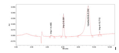 Optimal conditions for the technique System appropriateness parameters are listed in table 4. For Upadacitinib (UDB) and its impurities, the USP tailing factor is 0.69–1.58, indicating that the peaks have precise Gaussian forms and are symmetrical around their axis. By achieving a good resolution between the neighboring peaks, the USP plate count (68306-2225) demonstrates that the selected column is successful in resolving the sample components (fig. 12). Six Upadacitinib (UDB) injections were made in the system precision study, and the percentage RSD was determined to be 0.108 (<1%). This indicates that the amounts produced are accurate. Chromatograms for system appropriateness and system precision are displayed in table 5 and table 6.