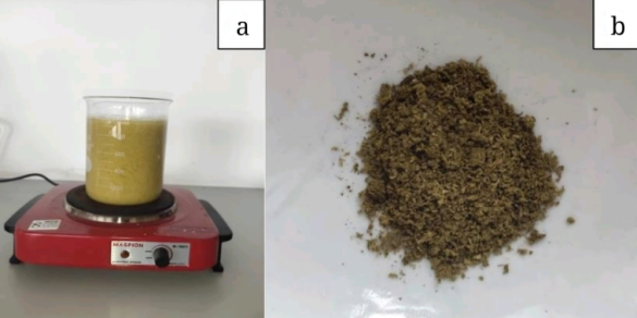 Fig. 2: (a) Hydrolsis process of α-cellulose from ketapang leaves (Terminalia catappa L.); (b) Results of microcrystalline cellulose ketapang leaves (MCCKL)