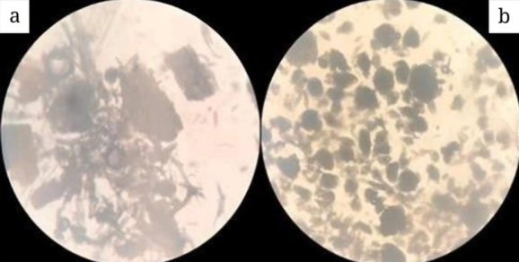 Fig. 4: (a) Microcrystalline cellulose ketapang leaves (MCCKL) microscopic test results using magnification scale 10x; (b) Avicel PH 102 microscopic test results using magnification scale 10x