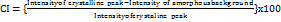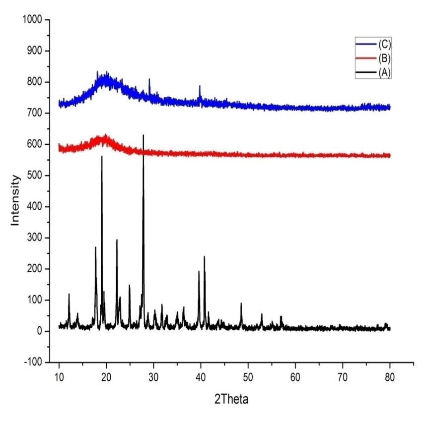 XRD analysis is a non-destructive technique that offers detailed information about the crystallographic structure, chemical composition, and physical properties of a material [44]. The powder XRD pattern of the optimized phytosome was recorded using a Shimadzu XRD-7000 diffractometer with a Cu-Kα radiation source operating at 40 kV. The diffraction data were collected across a scan range from 10.000° to 80.000°. The experiment employed Bragg-Brentano geometry with a 2θ scan rate of 0.020°/min at room temperature. The crystalline properties of the phytosome were analyzed using Origin Lab Software and the Crystallinity Index (CI) was calculated by using the following formula.