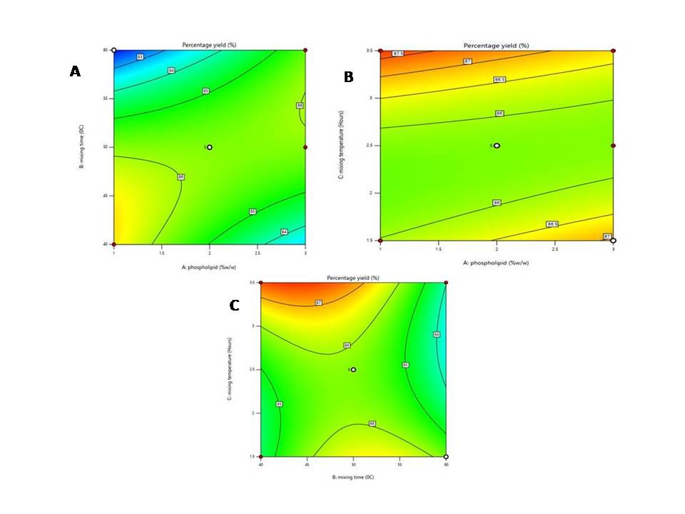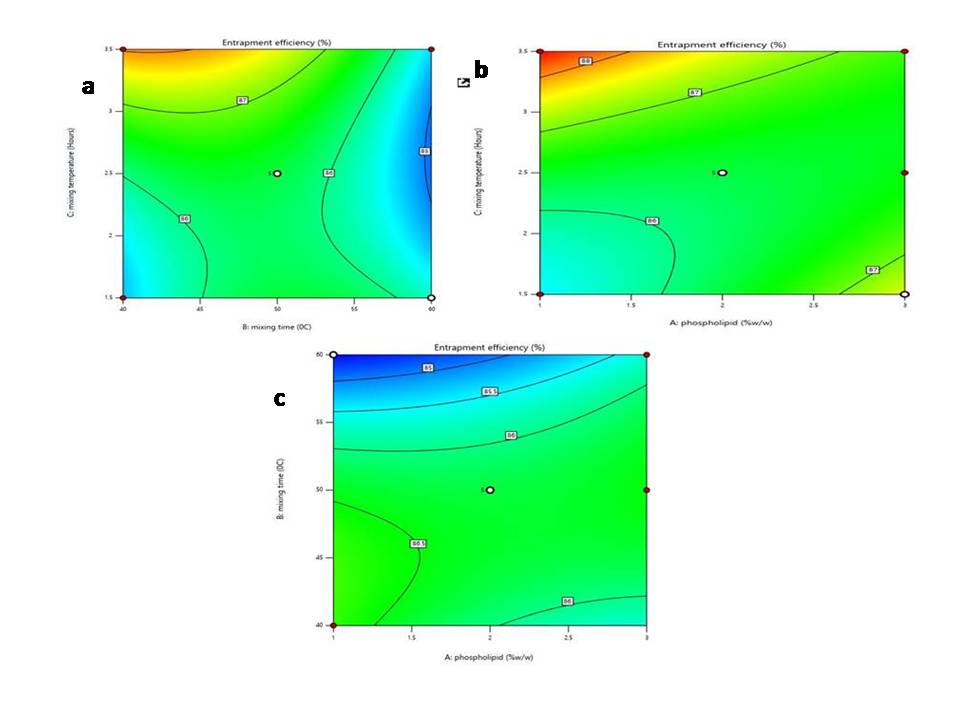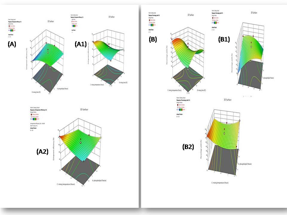 The Design Expert program was used to optimize the formulation of quercetin phytosomes. The factorial, three-level Box-Behnken Design (BBD) was used in this investigation [35, 36]. Table 2 displays the experimental design, which included three independent factors (phospholipid content, mixing temperature, and mixing time) and measured responses (Dependent variables; R1 Entrapment efficiency (EE). R2 Percentage Yield (PY)). Design Expert® from Stat-ease Inc., Minneapolis, was used to create three-dimensional and two-dimensional models (3D, 2D Models), as well as quadratic equations. The resultant quadratic polynomial equation is shown below: