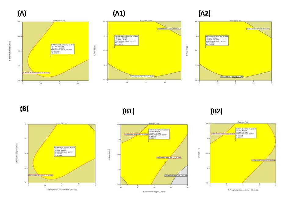 Throughout the design of tests for the three-level responses, the observed response ranges (R1:EE) for seventeen batches ranged from 84.48 to 88.59%, while (R2:PY) ranged from 82.01 to 88.06%. Table 3 displays the optimized formula for both responses. In addition to statistically significant term coefficients, the table shows the best-fitting model R-square values, which are 0.996 for response R1 and 0.992 for response R2. The collected data were analyzed using Design Expert software, applying first-order, second-order, and quadratic models for comparison. From the analysis, it was found that a p-value>0.05 indicates the lack of fit is non-significant. This is a good sign indicates the model adequately fits well and this model is appropriate.