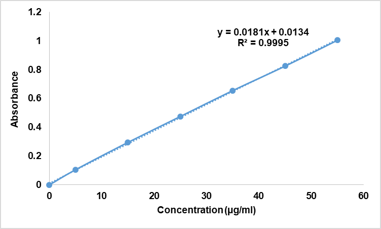 In the calibration curve of arnebin-1 ethanol standard solution as shown in fig. 2, the linearity was obtained for concentration range of 5–50 µg/ml with correlation coefficient (R²) of 0.9995. The linear regression equation obtained was y = 0.0181x+0.0134 in which y is the absorbance and x is the concentration in µg/ml, therefore the analytical method was precise and accurate.