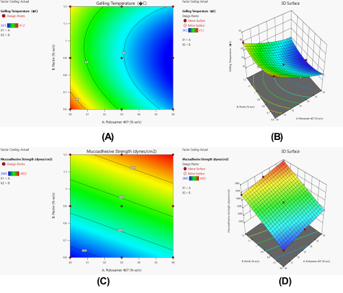The mucoadhesive strength analysis yielded a highly significant linear model (adjusted R² = 0.9990) with Pectin exhibiting a remarkably stronger influence (F-value = 10977.13) compared to Poloxamer 407 (F-value = 1433.48), as shown in table 7. The linear relationship, visualized through parallel contour lines in fig. 6C,D, demonstrates predictable polymer concentration effects that surpass the mucoadhesive properties reported in similar studies [49]. The optimized formulation KF6, containing Poloxamer 407 (36% w/v) and Pectin (0.9% w/v), achieved an ideal balance of properties with minimal prediction error (table 8). The excellent agreement between predicted and experimental values for gelling temperature (0% error) and acceptable deviation in mucoadhesive strength (6.29%) validates the reliability of the optimization process, comparing favorably with previous optimization studies of thermosensitive systems [50]. This optimization success, particularly the achievement of desirability value 1.0, suggests that the developed formulation could offer superior wound healing potential compared to conventional formulations [51].