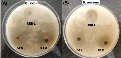 Fig. 8: Photographic representation of zones of inhibition demonstrating in vitro antibacterial activity of arnebin-1 loaded thermosensitive hydrogel against pathogenic bacteria: (A) E. coli and (B) S. aureus. ARB-1-Arnebin-1, KF6-Optimized Hydrogel, STD-standard