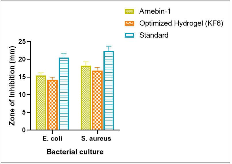 The in vitro antibacterial assessment revealed significant antimicrobial efficacy of both pure arnebin-1 and its optimized thermosensitive hydrogel formulation against common wound pathogens. The pure arnebin-1 demonstrated notable zones of inhibition against both tested organisms (table 11), with particularly strong activity against S. aureus (18.2±1.1 mm), suggesting promising potential against g-positive bacteria[59]. This selective effectiveness aligns with previous studies on natural naphthoquinone derivatives, which have shown enhanced activity against g-positive organisms [60]. The optimized hydrogel formulation KF6 maintained substantial antibacterial activity, exhibiting zones of inhibition of 14.2±0.7 mm and 16.8±0.9 mm against E. coli and S. aureus respectively, as visualized in fig. 8. This preservation of antimicrobial efficacy in the hydrogel format is particularly significant, as many natural compounds lose activity when incorporated into complex delivery systems [61].