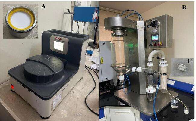 Fig. 1: IBR-NS developed using ball mill (A) followed by spray dryer technique (B) and spray dried product (C)