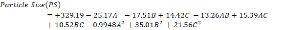 The quadratic equation provided for PS demonstrates that specific factors can either enhance or diminish the response. Factors that lead to an increase in PS include C (+14.42), the interaction term AC (+15.39), BC (+10.52), B2 (+35.01), and C2 (+21.56). These positive coefficients indicate that as these variables increase, the PS also increases. On the other hand, factors that result in a decrease in PS are A (-25.17), B (-17.51), the interaction term AB (-13.26), and A2 (-0.9948). These negative coefficients suggest that a gain in these variables leads to a reduction in PS [31, 32].