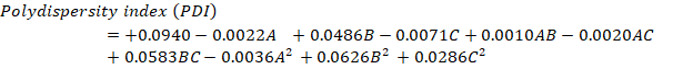 The provided quadratic equation representing the PDI illustrates that specific elements can either raise or lower the PDI value. The factors that lead to an increase in PDI include B (+0.0486), the interaction term AB (+0.0010), the interaction term BC (+0.0583), B2 (+0.0626), and C2 (+0.0286). These positive coefficients signify that as these parameters increase, the PDI value also increases. On the other hand, the factors that contribute to a decrease in PDI consist of A (-0.0022), C (-0.0071), the interaction term AC (-0.0020), and A2 (-0.0036). These negative coefficients indicate that an increase in these variables leads to a reduction in PDI. Fig. 3 displays the surface and 3D response contour plots that illustrate how different variables affect PDI [33, 34].