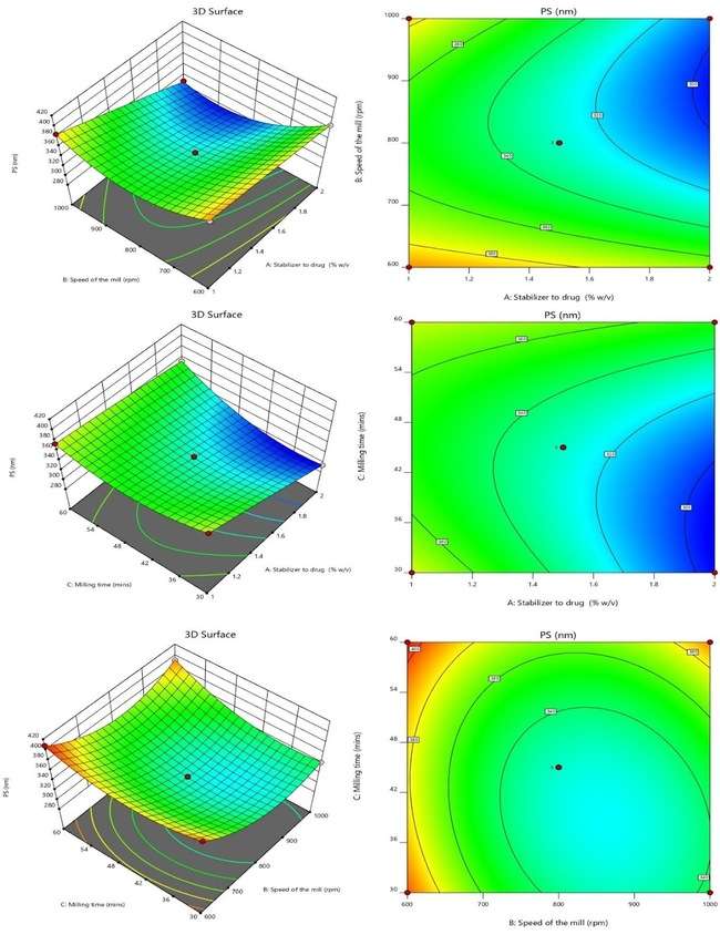 The selection of stabilizer-to-drug ratio, stirring speed, and milling time was based on initial pre-screening studies that indicated their significant impact on PS and PDI. Stirring rate directly influences shear forces during milling, affecting particle breakage efficiency. The stabilizer ratio determines steric and electrostatic stabilization, while milling time impacts size reduction without inducing thermal degradation. These were selected as critical factors based on preliminary results and literature reports supporting their role in particle engineering.