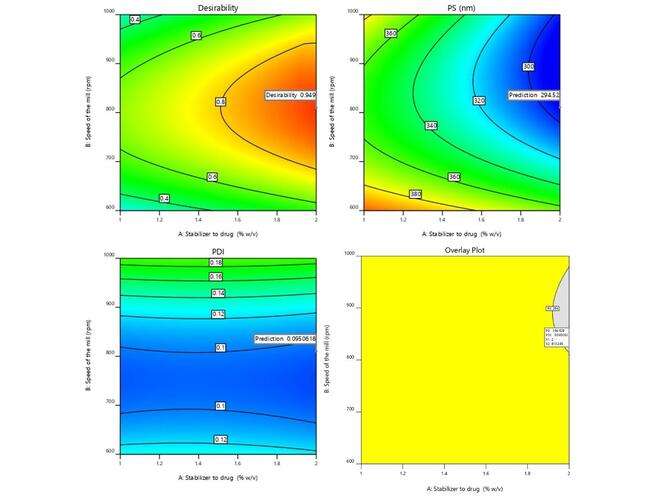 The factors affecting the response parameters were optimized using the Derringer's desirability approach. Through extensive searches, the responses were transformed into a desirability scale, combined into a geometric mean function, and ultimately, an overall desirability score was generated. The optimum configuration (Fopt solution) with drug to stabilizer ratio of is 2.0% w/v, at a D value of 0.949 was obtained with a milling speed of 810 (rpm) and a milling time of 40.6 min. By adjusting the specified values for CQAs like PS, PDI, were able to improve the potential for customized graphics. The design space and overlay plot are shown in fig. 4. The formulation and strength of the model were validated using three checkpoints. Supp. Table 1 indicates that the expected size mean values were 294.52 nm, with a PDI of 0.095 correspondingly, while the detected mean values were found to be 307.5 nm, with a PDI of 0.084 [35].