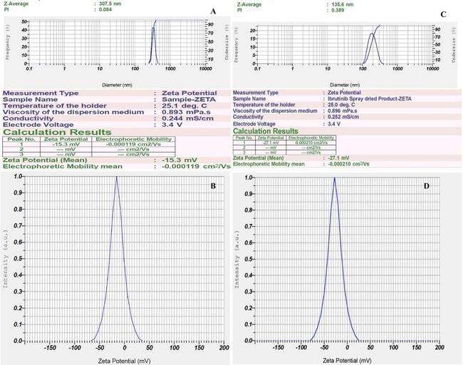 Fig. 5: Malvern image of A) Particle size, PDI after ball milling; B) ZP after ball milling; C) Particle size, PDI after spray drying; D) ZP after spray drying