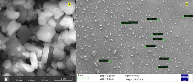 Fig. 6: SEM image of A) pure drug; B) Nanosuspension after spray drying (SD-F)