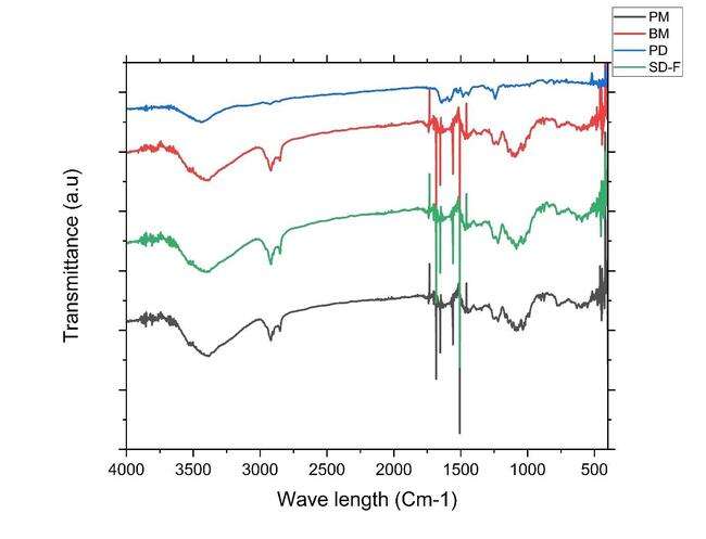 To determine component compatibility, FTIR was performed for the polymers used in study along with the drug (PD), physical mixture (PM), ball mill formulation (BM-F) and for spray-dried formulation (SD-F) as shown in fig. 7. All the samples were scanned from 400–4000 cm–1 range. The simple drug showed distinct peaks at (1241, 1147, 1100, 986, and 953 cm-1) [13].