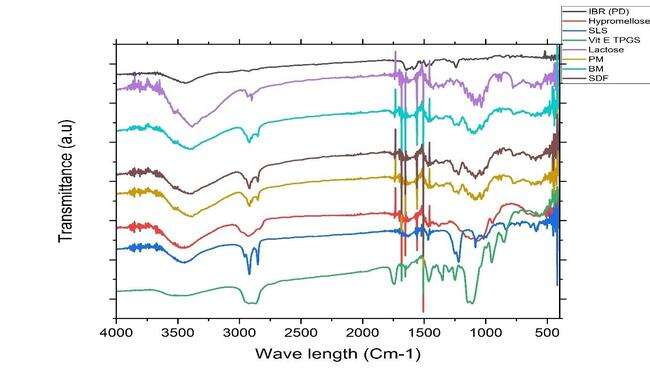 The FTIR spectra were obtained using a Bruker Optics Tensor 27 spectrometer manufactured in Germany, with a resolution of 1.0 cm-1. The study included the drug in its pure form (IBR), as well as its excipients (Hypromellose, SLS, Vit-E-TPGS, Lactose), a physical mixture, a ball milling formulation (BM-F), and a spray-dried nano-formulation (SD-F). The analysis spanned wave numbers ranging from 4000 to 400 cm-1 [23].