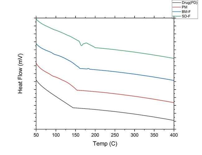 To ascertain the drug’s physicochemical characteristics and evaluate any possible chemical interactions with its excipients, DSC testing was carried out. Thermograms of the drug, excipients (Hypromellose, SLS, Vit-E-TPGS, Lactose), physical mixture (PM), ball milled nano-formulation (BM-F), and optimized spray-dried nano-formulation (SD-F) were recorded under nitrogen atmosphere using a DSC calorimeter (DSC-60, Kyoto, Japan). Heating was performed at a rate of 5 °C/min across a temperature interval of 400 °C [24].