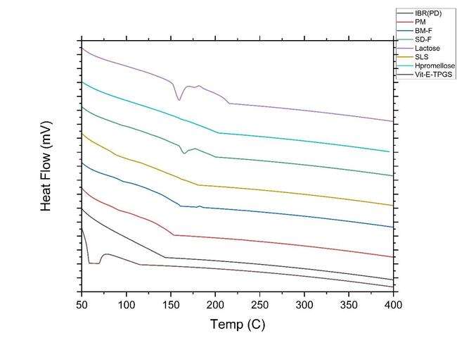 Fig. 8: B) DSC thermogram overlay of pure drug (PD black-line IBR); PM (red line-Physical mixture, BM-F NS (Ball mill formulation blue line-Nanosuspension); SD-F (spray dried formulation Green-line); Lactose (light purple-line); SLS(dark yellow-line); hypromellose (Light blue-line) and Vit E TPGS (dark purple-line)
