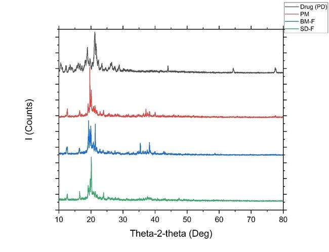 Fig. 9: (A) Overlay of XRD of i) Drug PD (black line); ii) PM (red color line), iii) Formulation-BM-F (Ball mill, bluecolor line); iv) Formulation-SD-F (spray dried green color line)